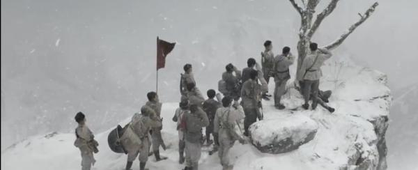 镜头再次回到老人睡着的操场上。随着五星红旗的飘扬和孩子们在点名的时候陆续答到,画面变成了风雪肆虐的战场。
