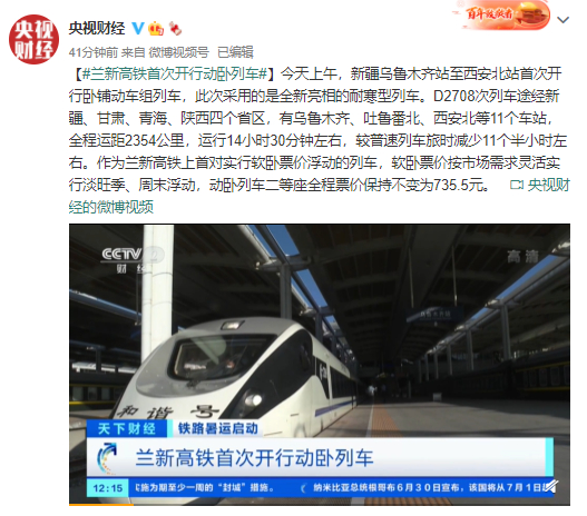 【#兰新高铁首次开行动卧列车#】今天上午,新疆乌鲁木齐站至西安北站首次开行卧铺动车组列车,此次采用的是全新亮相的耐寒型列车。D2708次列车途经新疆、甘肃、青海、陕西四个省区,有乌鲁木齐、吐鲁番北、西安北等11个车站,全程运距2354公里,运行14小时30分钟左右,较普速列车旅时减少11个半小时左右。作为兰新高铁上首对实行软卧票价浮动的列车,软卧票价按市场需求灵活实行淡旺季、周末浮动,动卧列车二等座全程票价保持不变为735.5元。