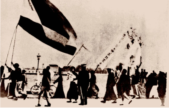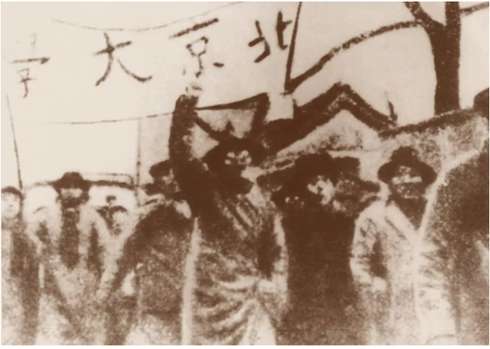 1919年5月4日,北京各大专学校学生3000余人集齐于天安门举行学界大示威。图为北京大学学生游行队伍。