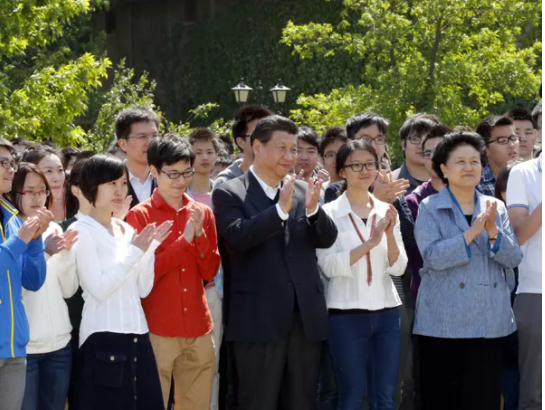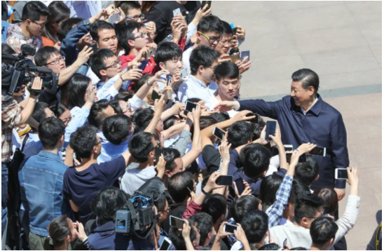 图为习近平离开学校时,道路两旁挤满了师生,大家向总书记问好,争相同总书记握手,齐声高喊“团结起来,振兴中华”,齐声高唱《歌唱祖国》。