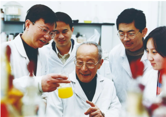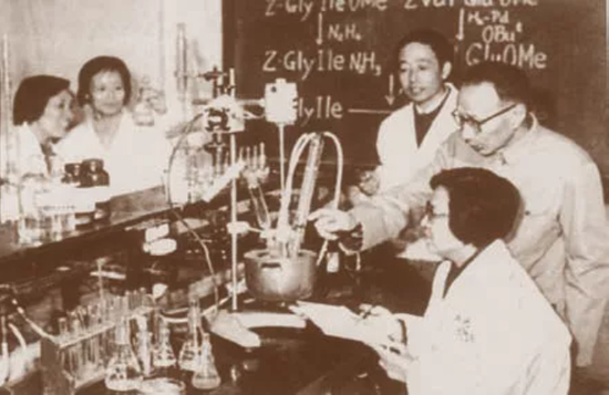 1964年,化学系邢其毅、季爱雪等先后赴上海与兄弟单位联合攻关,进行结晶牛胰岛素的全合成研究。图为邢其毅教授(右一站立者)在指导人工合成牛胰岛素的研究。