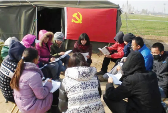 考古文博学院从2006年起探索在校外实习的考古队中建立临时党支部,图为考古队临时党支部在发掘现场学习党的十八大精神。