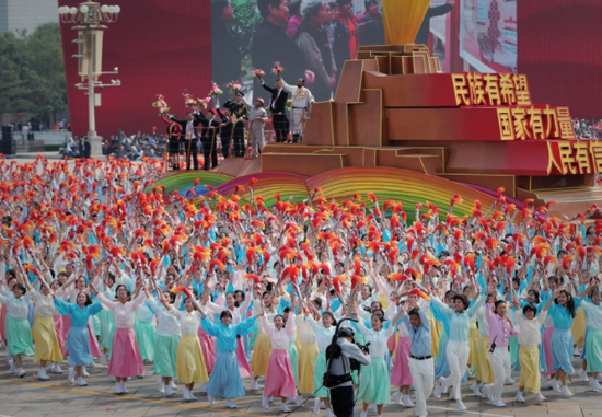 2019年10月1日上午,中华人民共和国成立70周年群众游行队伍中, 北京大学师生组成的“凝心铸魂”群众游行方阵,喊出响亮的口号:“团结起来,振兴中华!”