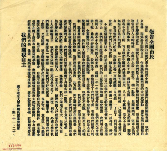 1925年,五卅惨案发生后,北大师生参与到反帝爱国运动热潮中,显示了高昂的爱国热情。图为五卅运动时北大教职员发布的《敬告全国市民》。