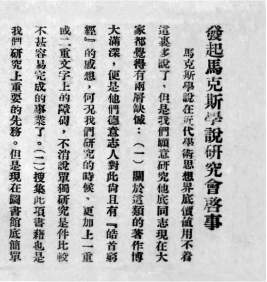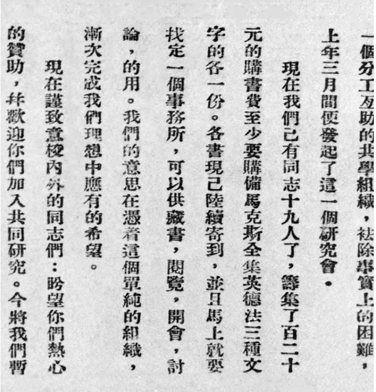 1920年3月,在李大钊指导下,马克思学说研究会秘密成立。图为1921年11月17日刊登在《北京大学日刊》上的启事。