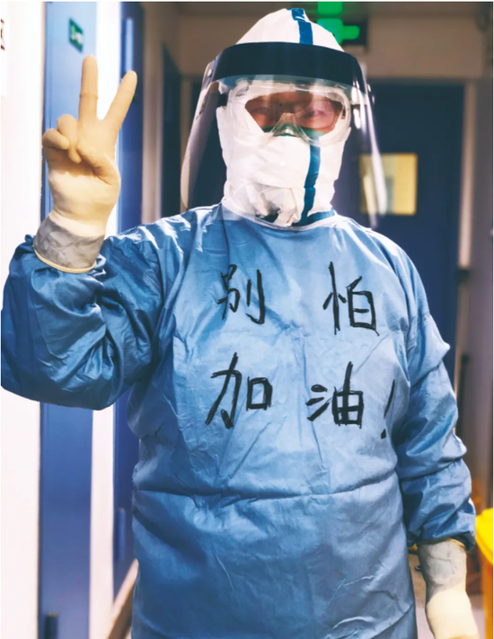 在抗疫一线,北大医学人以精湛的技术、博爱的精神竭尽全力与病毒展开殊死搏斗,抢救了众多患者的宝贵生命。图为2020年1月30日, 北京大学援鄂医疗队员暴婧医生在防护服上写上“别怕 加油!”安慰鼓励患者。