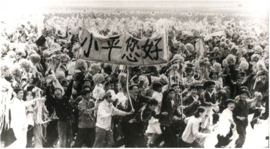 在国庆35周年游行队伍中,北大学生打出了“小平您好”的横幅。