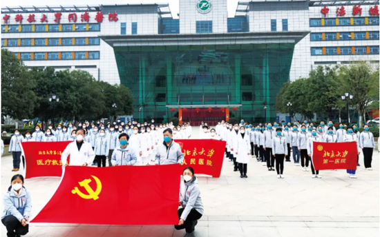 2020年3月1日,北京大学援鄂医疗队在抗疫前线重温入党誓词。