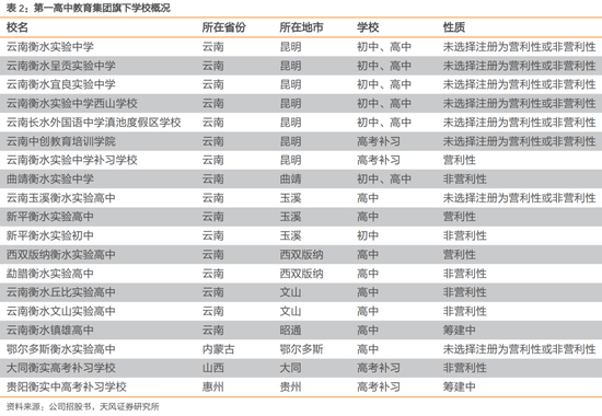 今年3月12日,民办教育企业第一高中教育集团正式在纽交所挂牌上市,据招股书介绍,第一高中教育集团在国内的主体公司为云南长水教育集团,成立于2005年,是全国第三大民办中学运营商,已建立19所学校,其中15所为高中学校,4所为高考复读学校,覆盖云南、贵州、四川、内蒙古、陕西、山西等省区市,同期在校学生人数达25867名。