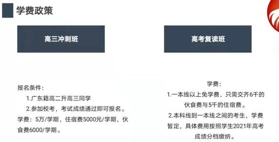 从官网介绍资料来看,衡中文化教育培训有限公司的定位是一所高三复读学校,今年招生计划分为高三冲刺班(广东籍高二升高三的学生)、高考复读班,这2个班的收费标准有所不同,上一本线的复读学生免学费,只交6000伙食费和5000住宿费,而应届生班的学费为5万/学期,再加上住宿和伙食费,共6.1万元/学期,意味着高三一年的费用高达12.2万元。