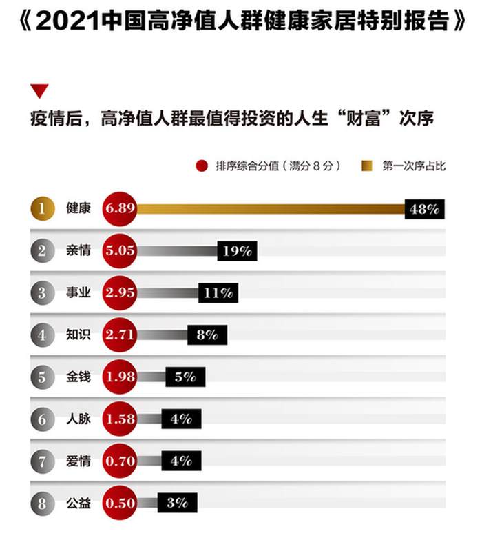 值得注意的是,疫情后,在健康、亲情、事业、知识、金钱等八项人生“财富”中,“健康”是受访高净值人群认为最值得投资的人生“财富”,排序综合得分6.89分(满分8分),48%的受访者将其排在首位。第二是亲情(5.05分),有19%的受访者选择。第三是事业(2.95分),有11%的受访者选择。选择“公益”的仅为3%。