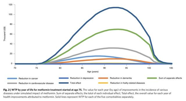 他们以二甲双胍为例。二甲双胍是一种用于治疗2型糖尿病的药物,但也被认为“对几种与年龄相关的疾病具有保护作用”,可以认为代表广义上对抗衰老。分析结果显示,二甲双胍的益处将是巨大的,往往与完全根除癌症、阿尔茨海默症或心血管疾病的益处相当或超过它们。