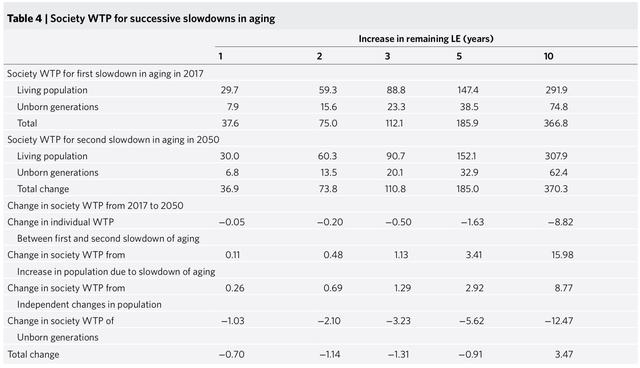 研究团队最后从计算个人收益转向计算社会各年龄层的总收益,同时也包括未出生的那几代人的收益。延迟衰老将导致人口的平均年龄和规模增加,这两者都将增加进一步改善的总WTP。“这就形成了延缓衰老的良性循环,社会越老龄化,任何进一步的改进就越有价值。”