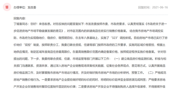 徐州市发改委在回复丁耀喜来信中表示,“我委已联合资规、住建等部门按照市政府的工作要求,实施同区域价格管控,根据土地供应情况,制定区域年度商品住房最高限价。在最高销售限价范围内确定备案价格,按照规定程序实施价格备案。二是徐州将严格要求房企,不得捆绑装修、捆绑车位等,让刚需买得到房。”