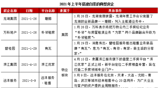 而在2021年上半年,越来越多头部房企升级自身租售业务,自建渠道主动拓客,意在减轻对分销的依赖,同时有望在存量市场分一杯羹。如龙湖集团成立全新品牌“塘鹅”,服务覆盖房屋租售、装配式整装、家居装饰等,被纳入主航道业务;万科和碧桂园也分别发布“朴邻租房”“有瓦”,作为租售业务的新品牌亮相。