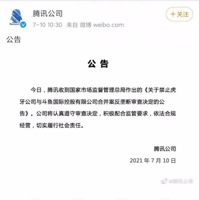 对此,腾讯回应称,“今日,腾讯收到国家市场监督管理总局作出的《关于禁止虎牙公司与斗鱼国际控股有限公司合并案反垄断审查决定的公告》。公司将认真遵守审查决定,积极配合监管要求,依法合规经营,切实履行社会责任。”