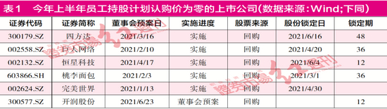 在认购价方面,当下的员工持股计划和股权激励计划越来越相似。根据《上市公司股权激励管理办法》,“上市公司在授予激励对象限制性股票时,应当确定授予价格或授予价格的确定方法。授予价格不得低于股票票面金额,且原则上不得低于下列价格较高者:(一)股权激励计划草案公布前1个交易日的公司股票交易均价的50%;(二)股权激励计划草案公布前20个交易日、60个交易日或者120个交易日的公司股票交易均价之一的50%。上市公司采用其他方法确定限制性股票授予价格的,应当在股权激励计划中对定价依据及定价方式作出说明”。而目前上市公司员工持股计划的员工认购价多为格力电器式的五折转让,1元/股的员工认购价也不在少数,部分公司的员工更是以零对价受让公司股份(见表1)。而这部分员工认购的股份一旦解禁,这些公司的股价将面临抛售的压力。