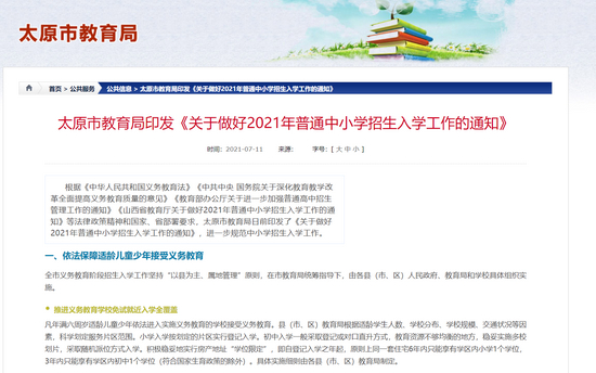 根据《中华人民共和国义务教育法》《中共中央 国务院关于深化教育教学改革全面提高义务教育质量的意见》《教育部办公厅关于进一步加强普通高中招生管理工作的通知》《山西省教育厅关于做好2021年普通中小学招生入学工作的通知》等法律政策精神和国家、省部署要求,太原市教育局日前印发了《关于做好2021年普通中小学招生入学工作的通知》,进一步规范中小学招生入学工作。