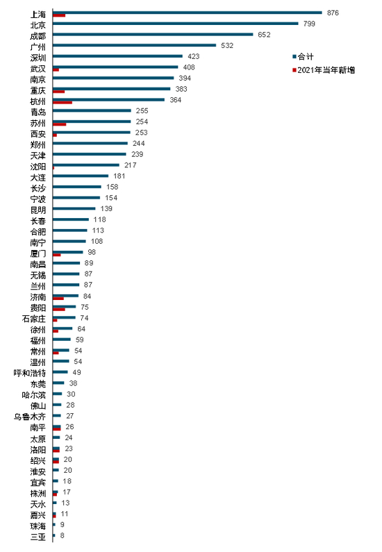 各城市累计运营线路长度与2021年新增线路长度(公里)