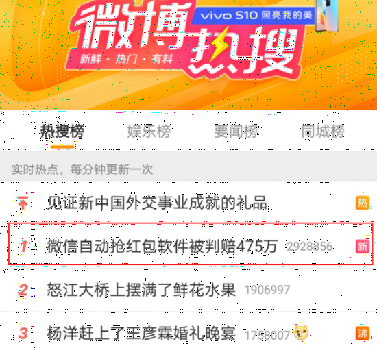 热搜第一:腾讯赢了!“微信自动抢红包”软件开发者被判赔偿475万