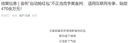 据北京知产法院7月16日通告,该院近日审结了这例也是首例与自动抢红包有关的不正当竞争纠纷案。