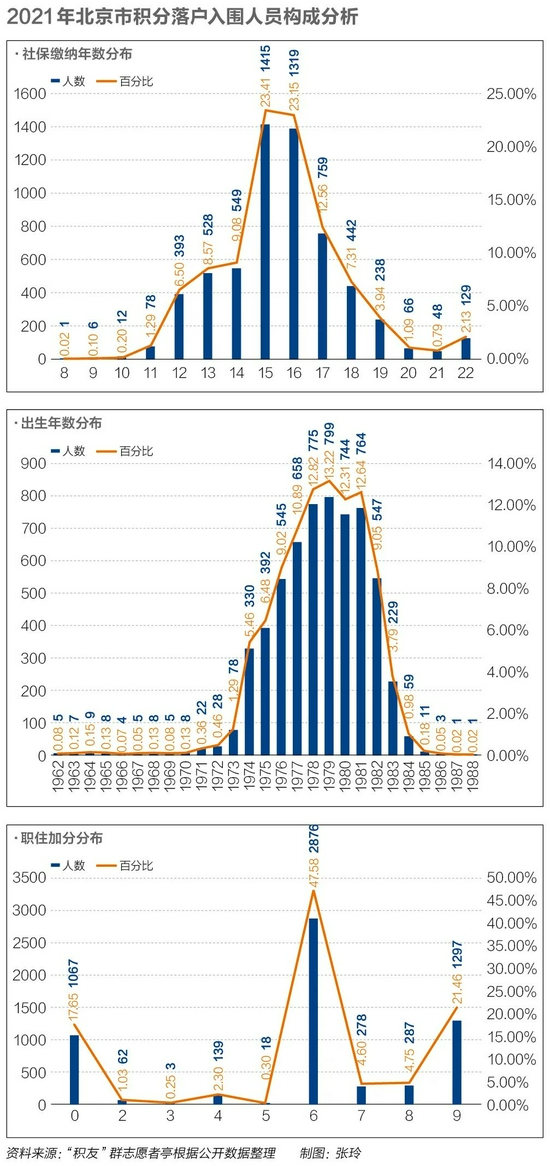 张芮观察到,从申请人合法稳定就业年限看,2018年平均年限为14.87年,2021年上升到16年。张芮说,这意味着,一位22岁本科毕业参加工作的年轻人,起码需要在京连续工作(缴纳社保)16年以上,自住房14年以上,直到他40岁前后,才有得到北京户口的可能。