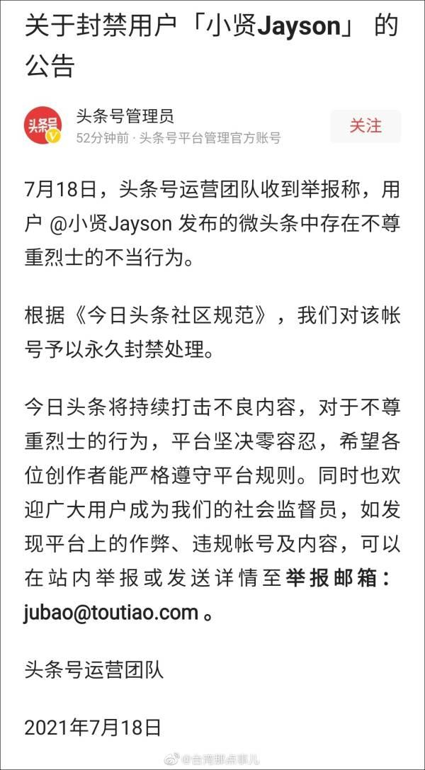 18日下午,今日头条发布公告,对涉事旅游博主账号予以永久封禁处理。
