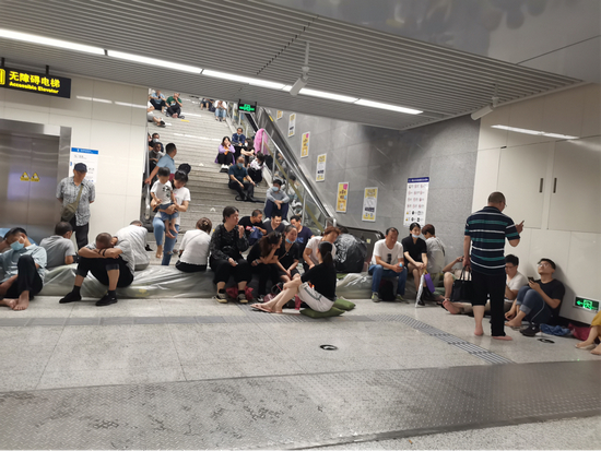 此时是晚上7点,地铁广播显示因为外部水位过高,暂时无法出站。老人、小孩、男人、女人们在等待中失去了体面,许多人脱下鞋,坐在台阶上、停掉的电梯上、甚至地上,他们面露疲态。