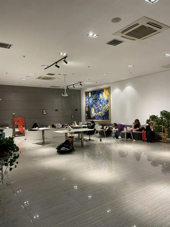 凌晨近2点,王先生来了,附近这片写字楼,有二三十个地方在免费收留被困人员。他刚从外地自驾游回来,困在了家门口。他原想绕路走高架,但天黑,看不清路,几个小时后,车子熄了火。他将车留在一个十字路口。
