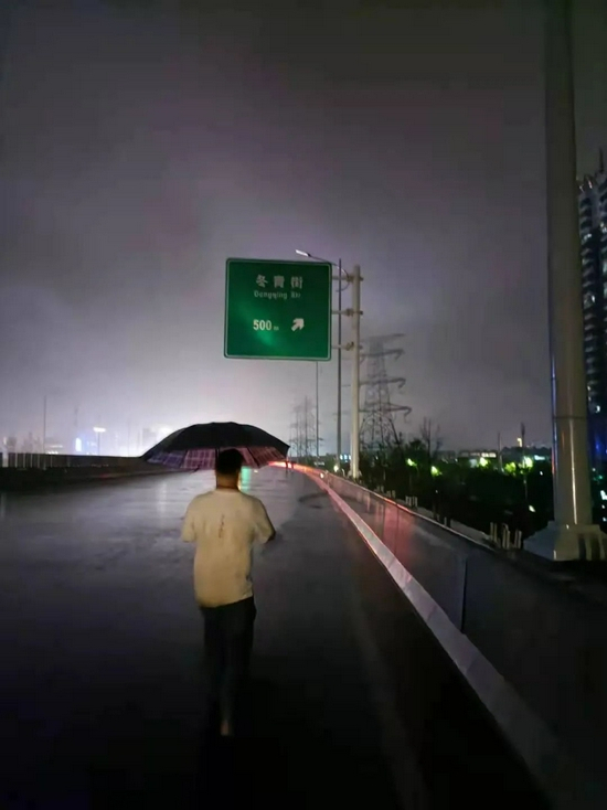 现场救援力量有限,我在那里待了一个小时,先买了一瓶水,补充了些水分,感觉身上的衣服干了就开始用手机查询回家路线。由于害怕主干道有危险,第一时间就是往高架上走,雨下的已经没那么大了,我想趁着现在还能走一走。