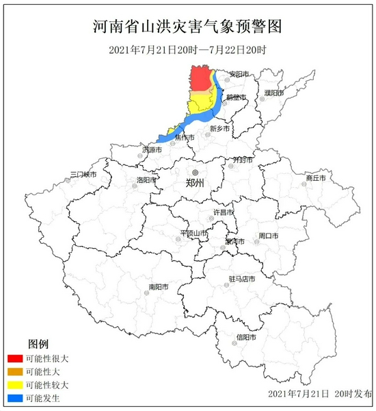 根据7月21日20时~22日20时山洪灾害气象预警,河南北部部分地区发生山洪灾害可能性大(橙色预警),局地发生山洪灾害可能性很大(红色预警)。