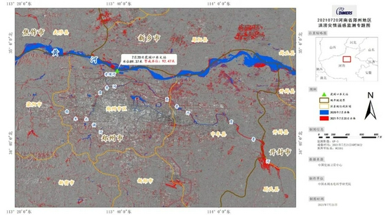 中国水科院迅速组织专家团队应用遥感和水文水动力模型,对郑州市及周边地区暴雨洪涝形势及灾害风险进行了分析。截至21日8时,20个河段流量超20年一遇,62个河段流量超50年一遇,6331个村庄受山洪威胁,洪涝影响范围达4010km2。