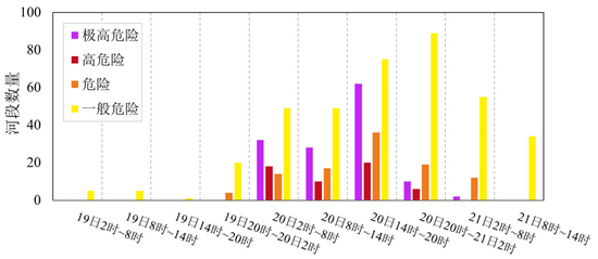 图6 2021年7月19日2时~21日14时河南省逐6h不同危险性等级河段数量