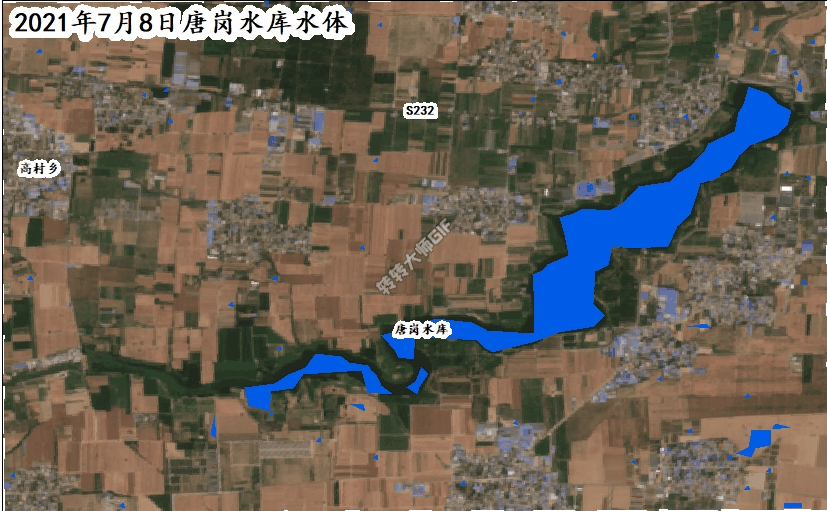 强降雨致使郑州周边的水库处于高水位运行状态,其湖面积较8日均有不同程度扩大,尤其是丁店水库、唐岗水库等库面面积变化明显(图4)。