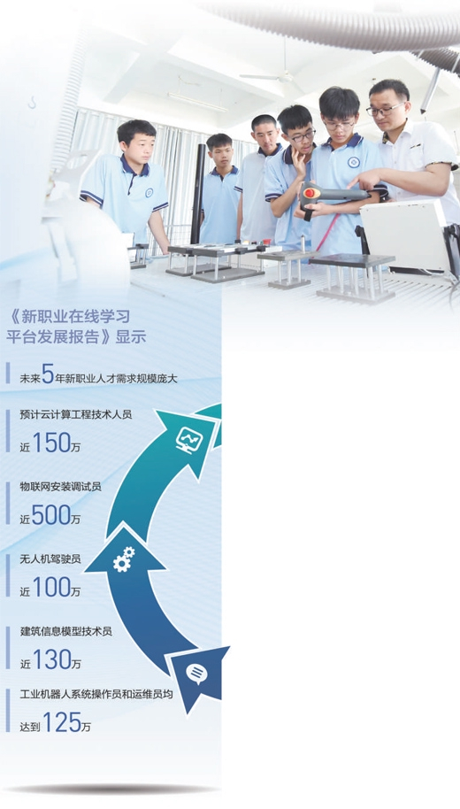 从需求规模来看,新职业具有广阔的前景。人社部中国就业培训技术指导中心发布的《新职业在线学习平台发展报告》显示,未来5年新职业人才需求规模庞大,预计云计算工程技术人员近150万、物联网安装调试员近500万、无人机驾驶员近100万、农业经理人近150万、人工智能人才近500万、建筑信息模型技术员近130万、工业机器人系统操作员和运维员均达到125万,人才缺口近千万。