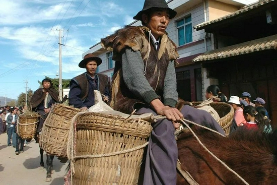 2004年11月28日,驮着货物的一队马帮经过茶马古道小集镇。图|新华社