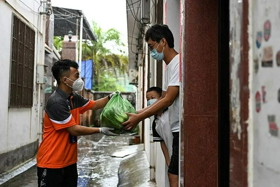 2021年7月9日,瑞丽市快递行业志愿者将生活物资送至居民家门口。图|新华社