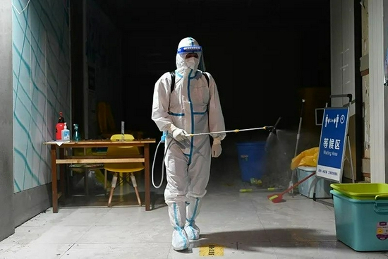 2021年7月8日,瑞丽市一家隔离酒店的防疫人员在对通道进行消杀。图|新华社