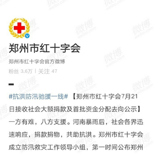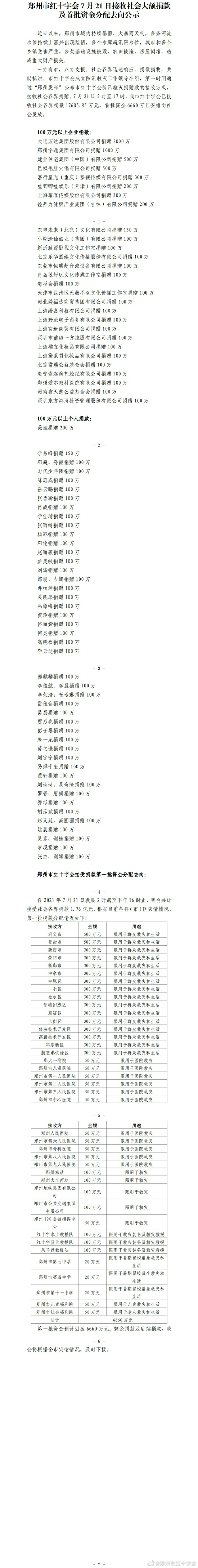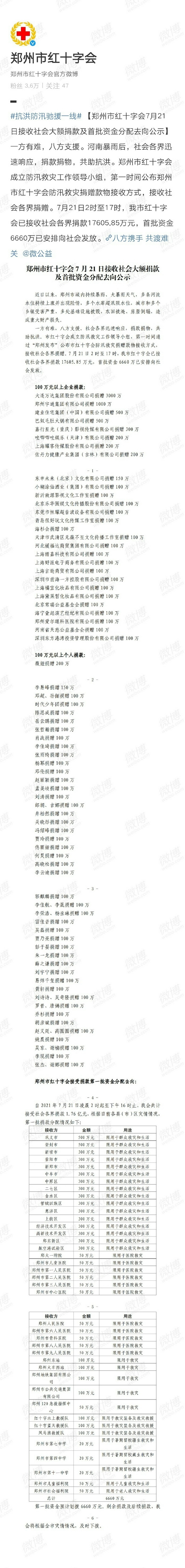 7月22日,郑州市红十字会发布微博公布21日接收社会大额捐款情况及首批资金分配情况。7月21日2时至17时,郑州市红十字会已接收社会各界捐款合计17605.85万元,首批资金6660万已安排向社会发放。