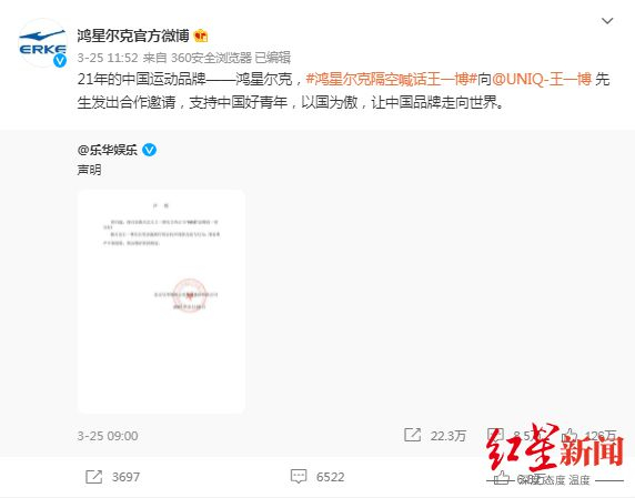 在上述声明发出来后不到3个小时,鸿星尔克用官微隔空喊话:“21年的中国运动品牌——鸿星尔克向王一博先生发出合作邀请,支持中国好青年,以国为傲,让中国品牌走向世界。”