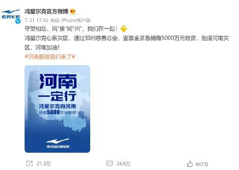 7月21日,鸿星尔克在其微博发布消息称,公司通过郑州慈善总会、壹基金紧急捐赠5000万元物资,驰援河南灾区。