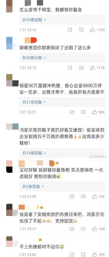 在一众网友留言后,话题#鸿星尔克的微博评论好心酸#一度登上微博热搜榜第一名。