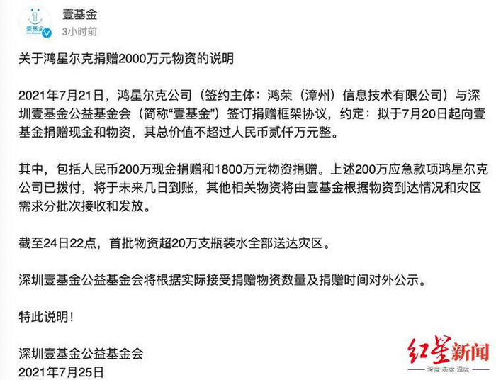 除了郑州慈善总会,25日上午11时,壹基金也发布了“关于鸿星尔克捐赠2000万元物资的说明”。