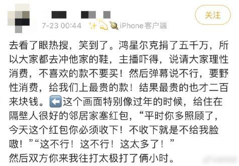 不同于其他直播间卖力吆喝的商家,7月22日晚间开始,在鸿星尔克(厦门)实业有限公司(以下简称为鸿星尔克)的直播间里,主播不停高呼"请大家理性消费,不用刷礼物,谁的钱也不是大风刮来的"。这样的口播却被网友直接拒绝,纷纷在评论区打出上述留言,还放出"豪言"称:"不买到工厂缝纫机冒烟,算我们输。"