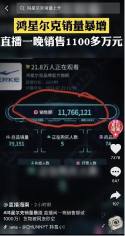 据媒体报道,鸿星尔克7月22日直播时长23小时,商品销量超过7.9万件,销售额突破1100万元。