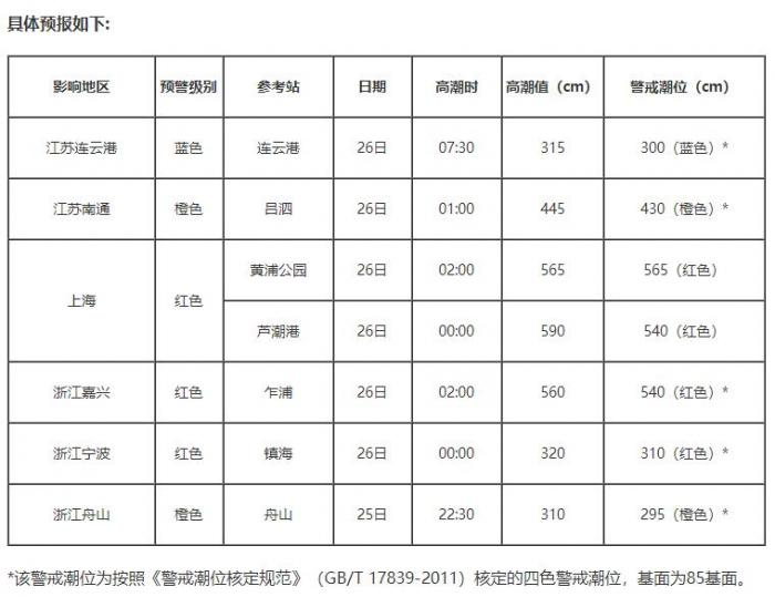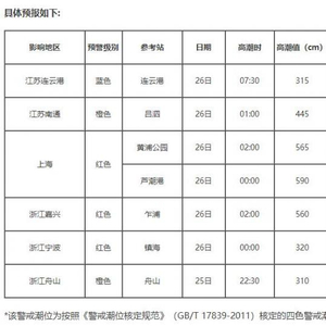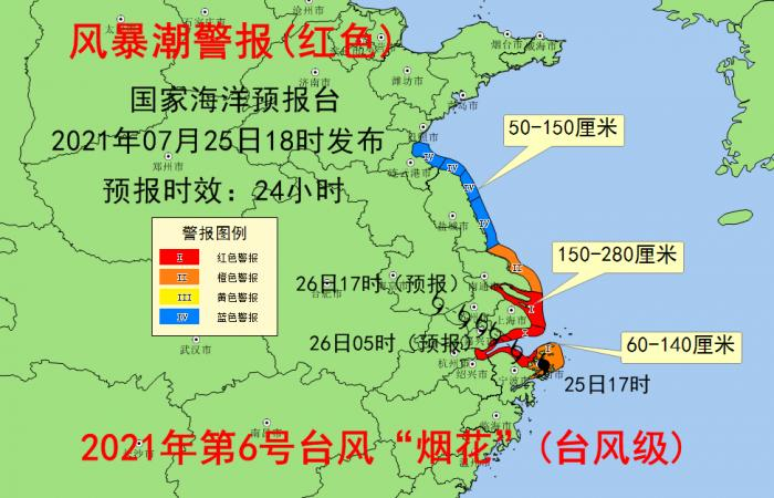 预计7月25日傍晚至26日白天,江苏连云港到盐城沿海将出现50到150厘米的风暴增水,江苏南通到杭州湾北岸沿海将出现150到280厘米的风暴增水,杭州湾南岸到浙江舟山沿海将出现60到140厘米的风暴增水。上述岸段内的上海黄浦公园、芦潮港、浙江乍浦和镇海潮位站将于26日夜凌晨前后出现达到当地红色警戒潮位的高潮位,杭州湾岸段可能出现破历史记录的高潮位。上海市、浙江嘉兴市、绍兴市和宁波市的风暴潮预警级别为红色,江苏南通市和浙江舟山市的风暴潮预警级别为橙色,江苏连云港市和盐城市的风暴潮预警级别为蓝色。