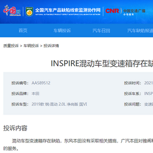 中国网汽车7月26日讯(记者 李池)近日,中国网汽车质量投诉平台接到了一位2019款东风本田INSPIRE锐•混动车型车主的投诉。车主周先生表示,东风本田INSPIRE混动车型变速箱存在设计缺陷,希望厂家能为车辆变速箱提供10年或20万公里的延保服务。周先生称,其INSPIRE锐•混动车辆已行驶了2年1.6万公里,虽然目前变速箱还没有出现问题,但他看到很多更高行驶里程同款车辆的变速箱却出现了故障,他也非常担心自己的车辆突然“中招”。