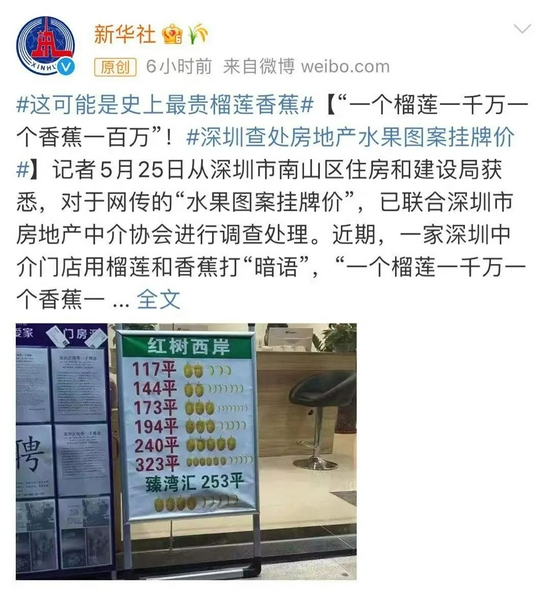 为了展示房屋挂牌价,深圳南山的房产中介想出奇招:用榴莲和香蕉代替货币计算单位,一个榴莲代表1000万元,一根香蕉代表100万元。
