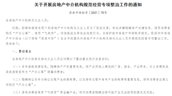 深圳市房地产中介协会28日在官网发布关于开展房地产中介机构规范经营专项整治工作的通知,在该市范围内对房地产中介机构及相关从业人员开展规范经营专项整治工作。