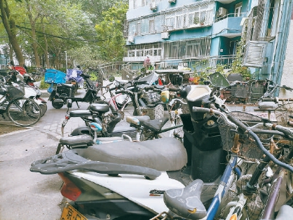 常青园小区里,低层板楼、高层塔楼错落分布,几乎每栋楼下都规划有多个停车位,小区内环形消防道路两边,也规划有汽车车位,但是楼下却没有自行车停车位,只在几栋楼之间有少量的停车棚。如今停车棚里已经停满了车辆,每栋楼楼下都有至少七八辆电动车见缝插针地停放在楼门口附近。